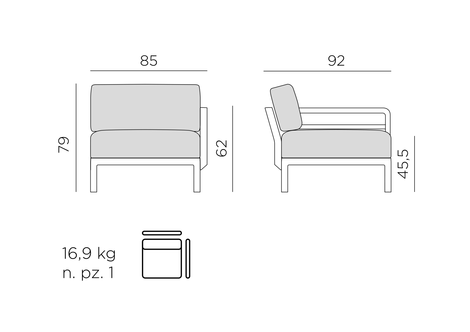 Fotoliu cu o singură cotieră (dr. sau st.), cu structură din rășină regenerată și țesături care conțin o cantitate mare de material reciclat. Disponibil separat sau configurabil ca element central al canapelei modulare Maximo.