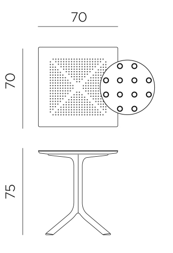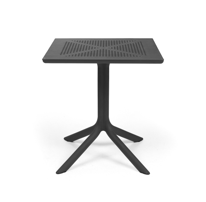 Concepută special pentru a ocupa foarte puțin spațiu, Clip este o masă pătrată profesională din rășină cu fibră de sticlă, cu un picior central cu patru brațe și blat DurelTop, cu un model rotund perforat.