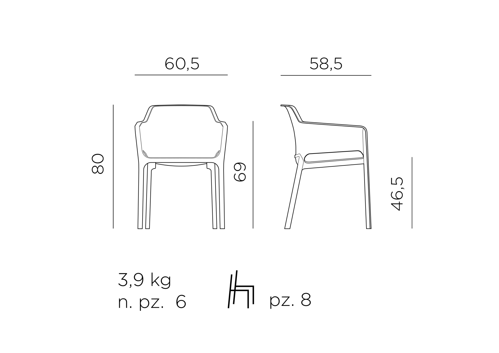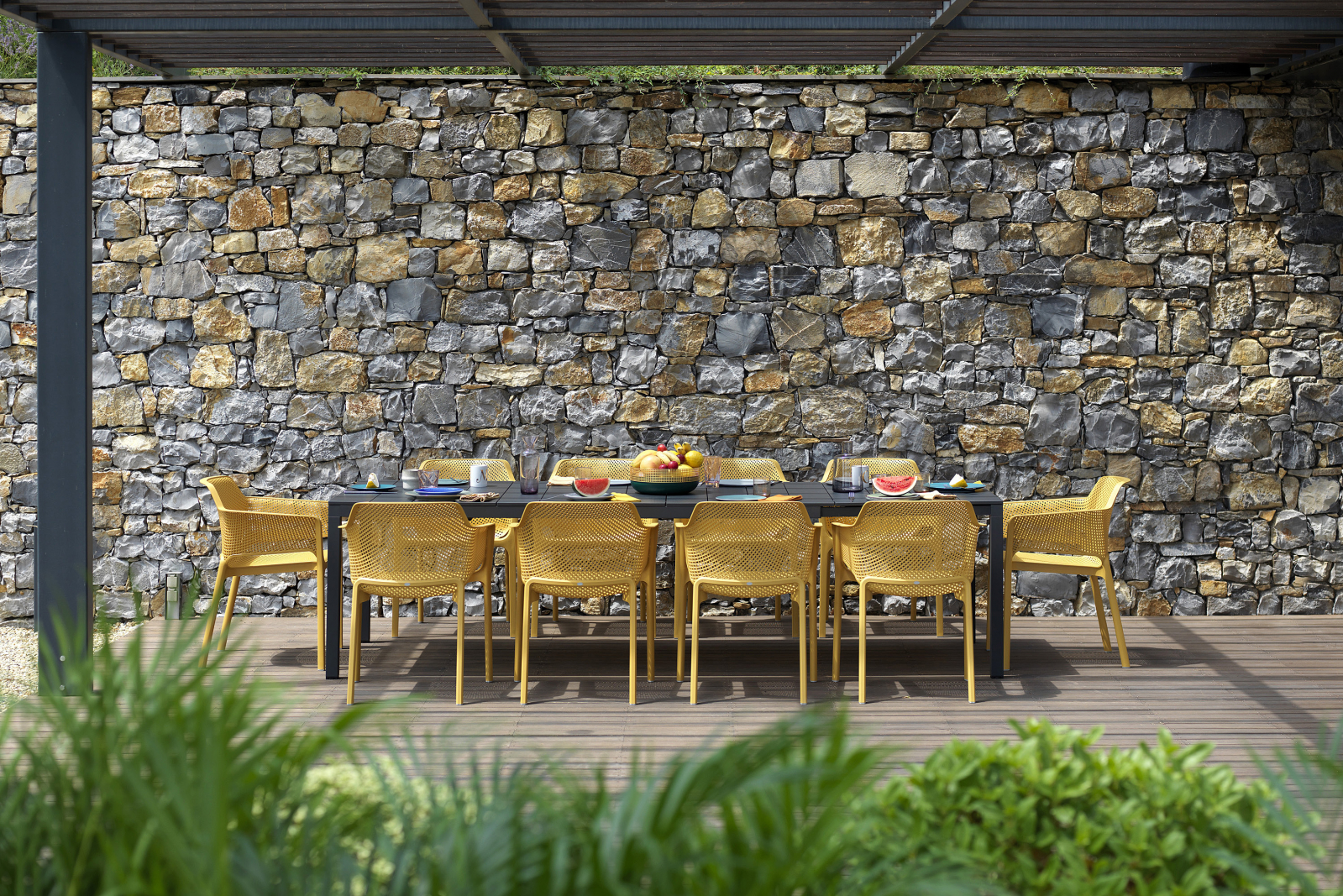 Net înseamnă relaxare rafinată: un scaun dintr-o singură bucată din rășină din fibră de sticlă, decorat cu un model radial de perforații pătrate pe întreaga suprafață a scaunului.