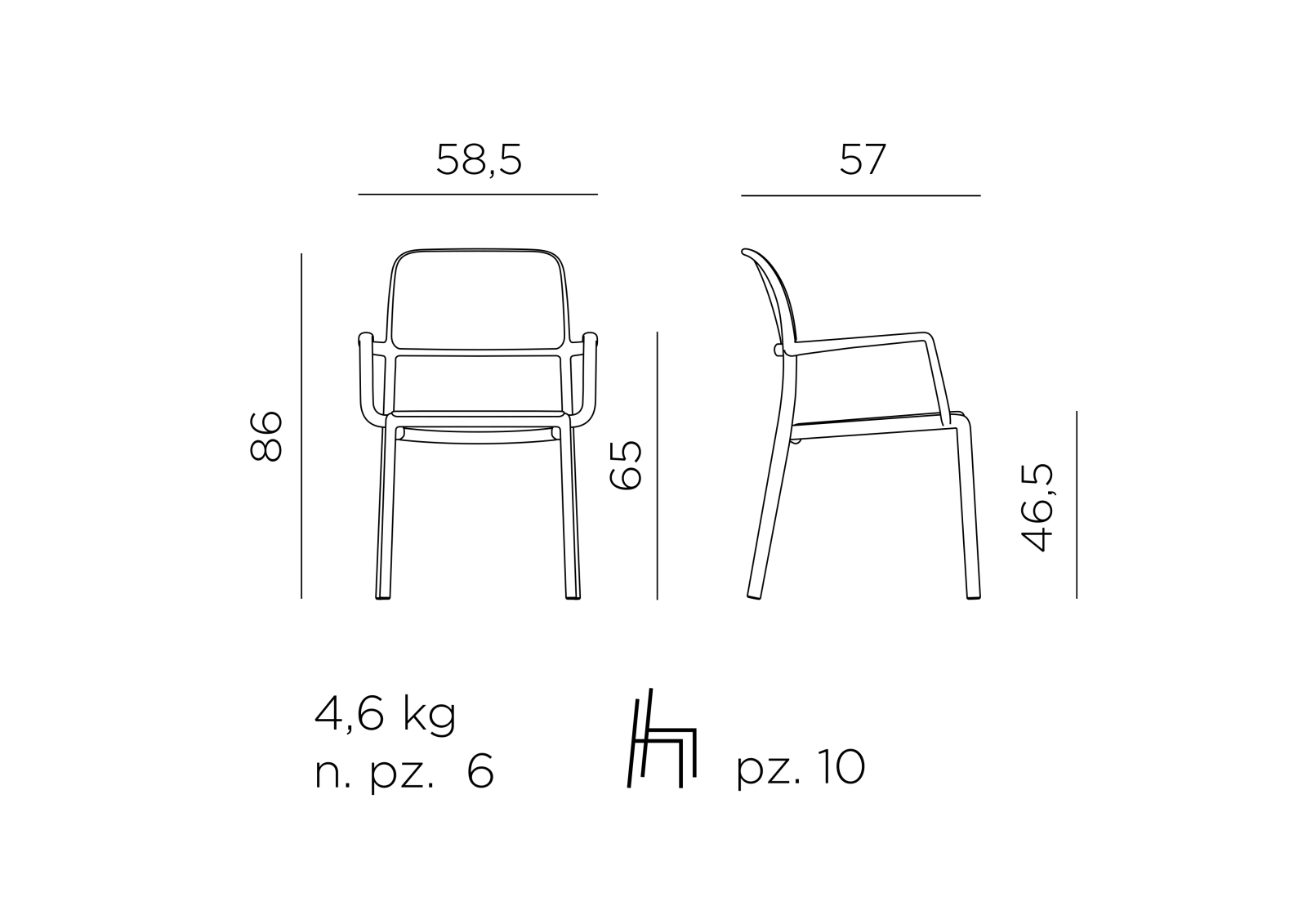 Scaun din fibră de sticlă cu cotiere și linii curate, minimaliste. Cadru tubular fără suduri, cu colțuri și profil rotunjite; scaunul și spătarul formează o singură piesă. Ușor, ușor de manevrat și stivuibil.